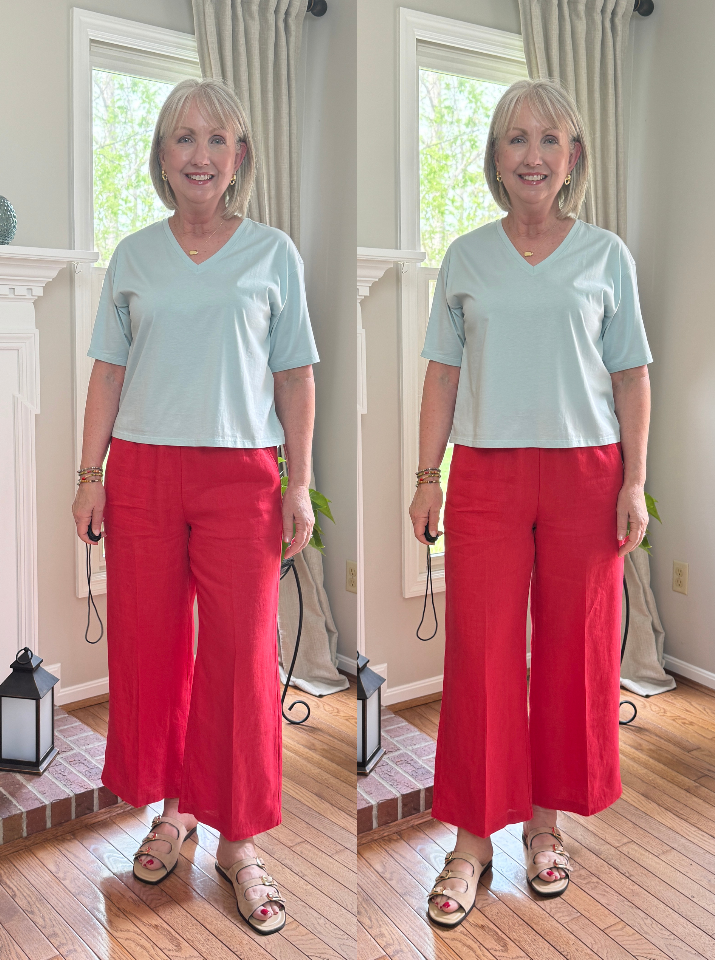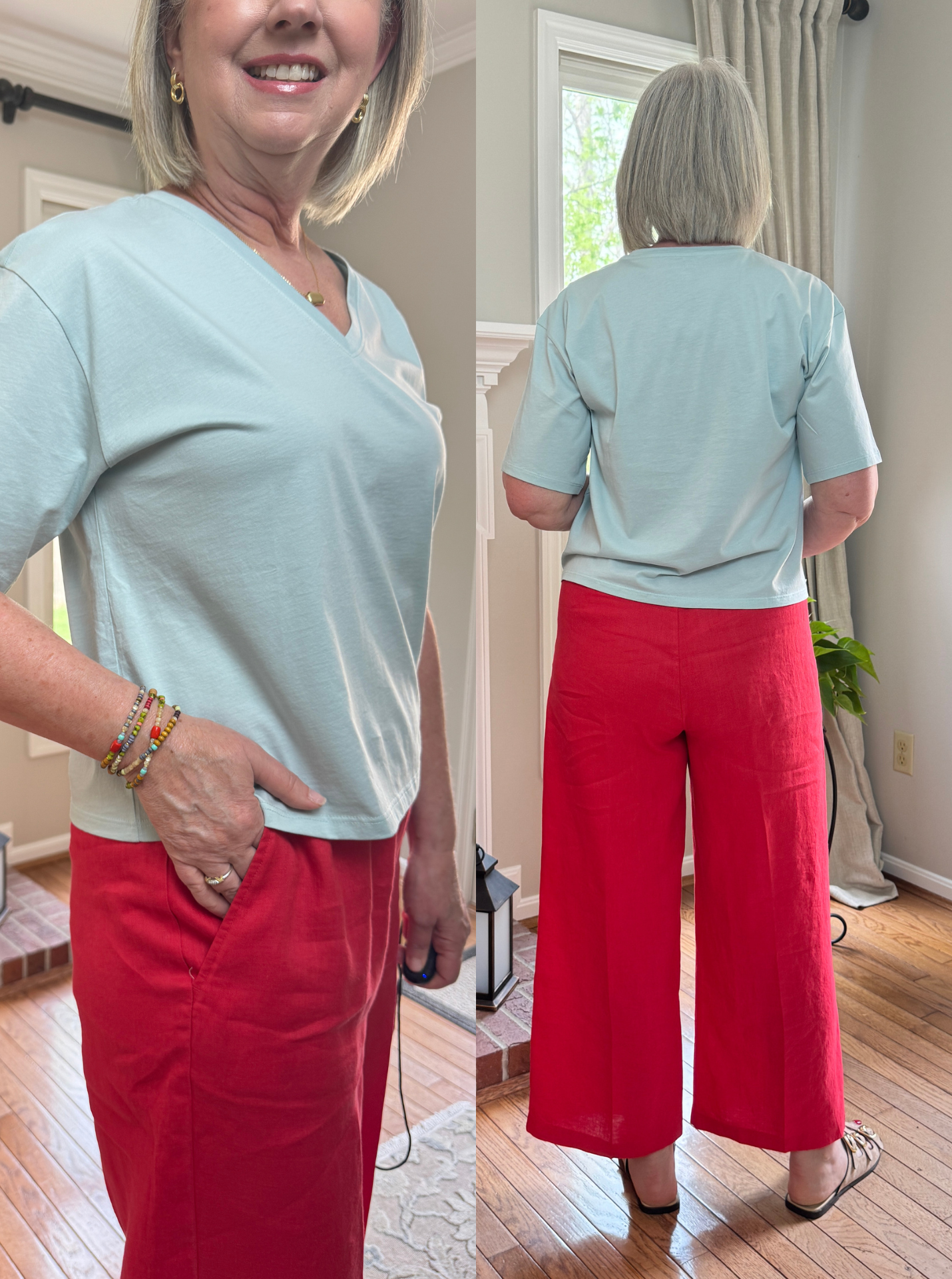 The organic Pima cotton jersey V-neck tee is silky soft and the slightly cropped length provides good proportions for the ankle length organic linen wide leg pants. I love the combination of the breeze turquoise with the grenadine red for a casual, everyday look. Remember, Eileen Fisher carries a wide range of sizes (xxs to 3x) and petites in their pants and dresses.