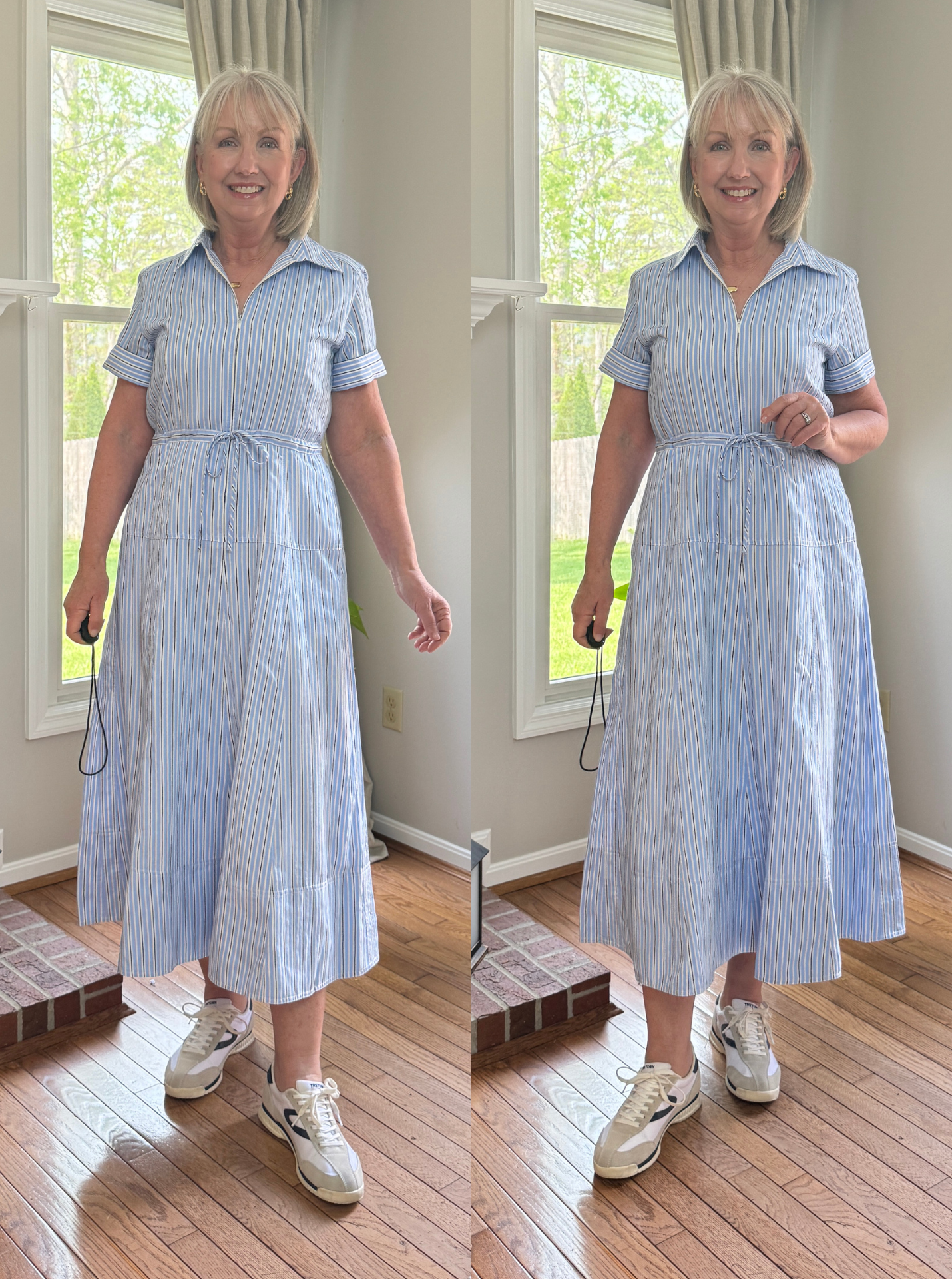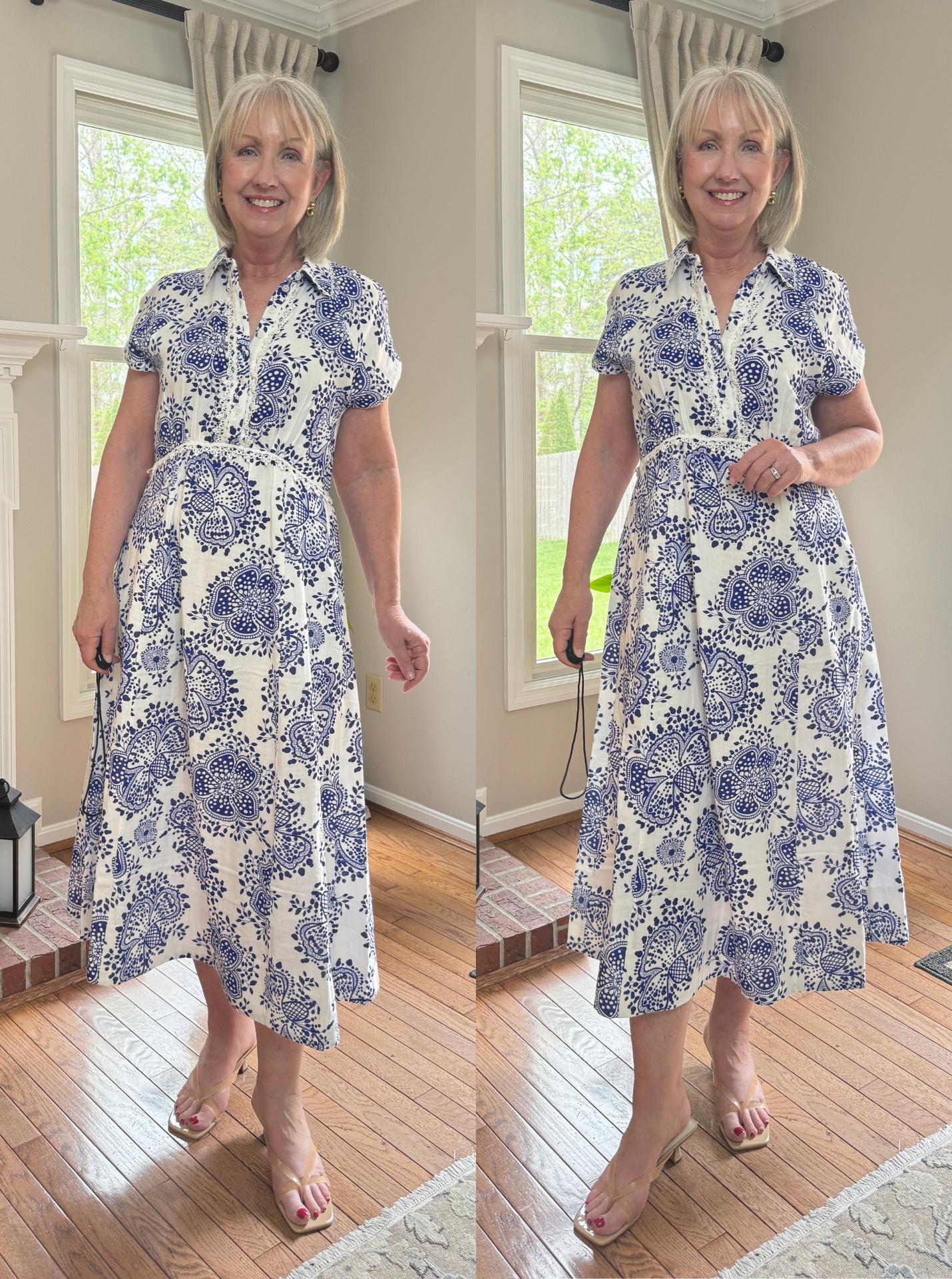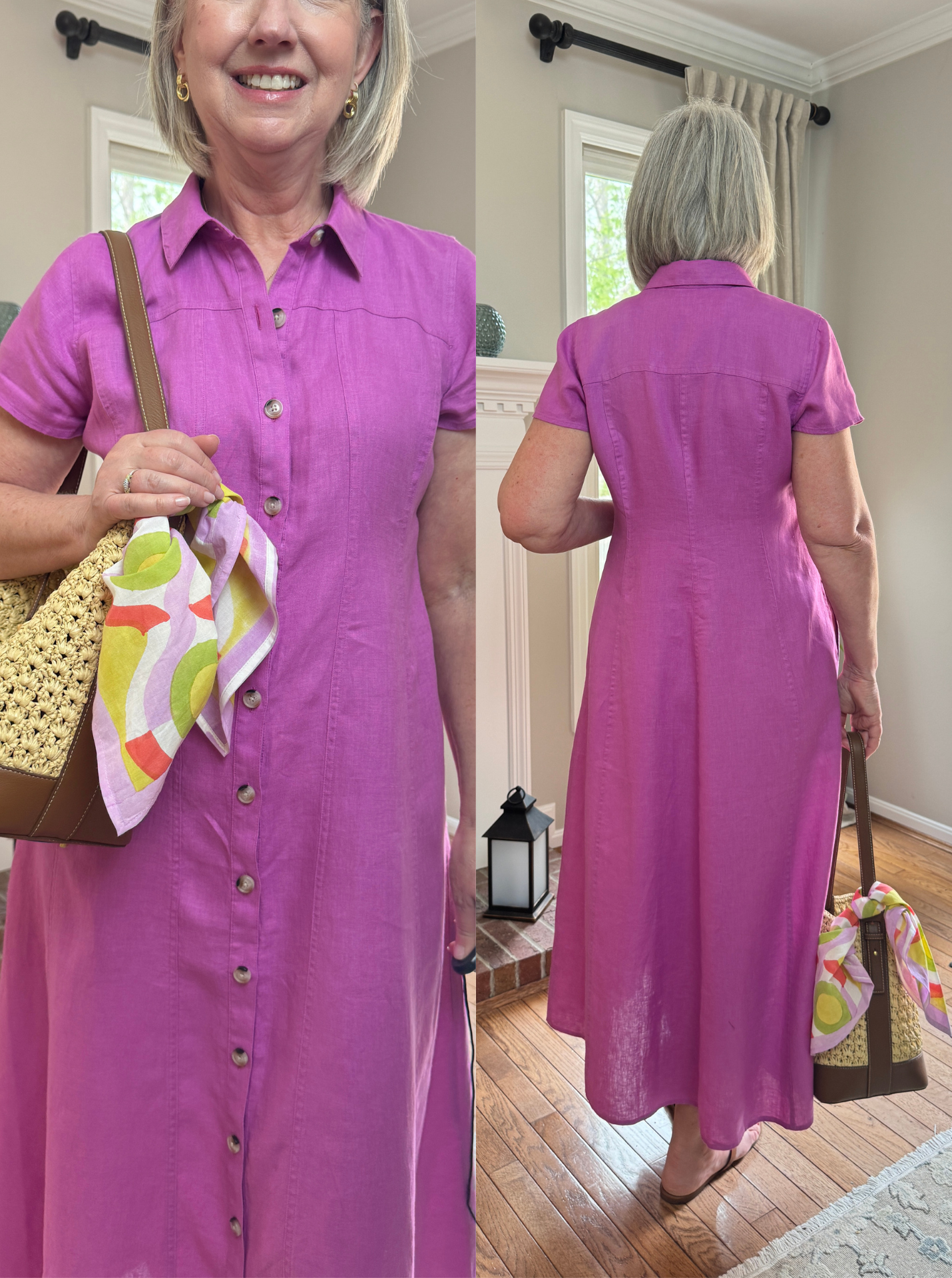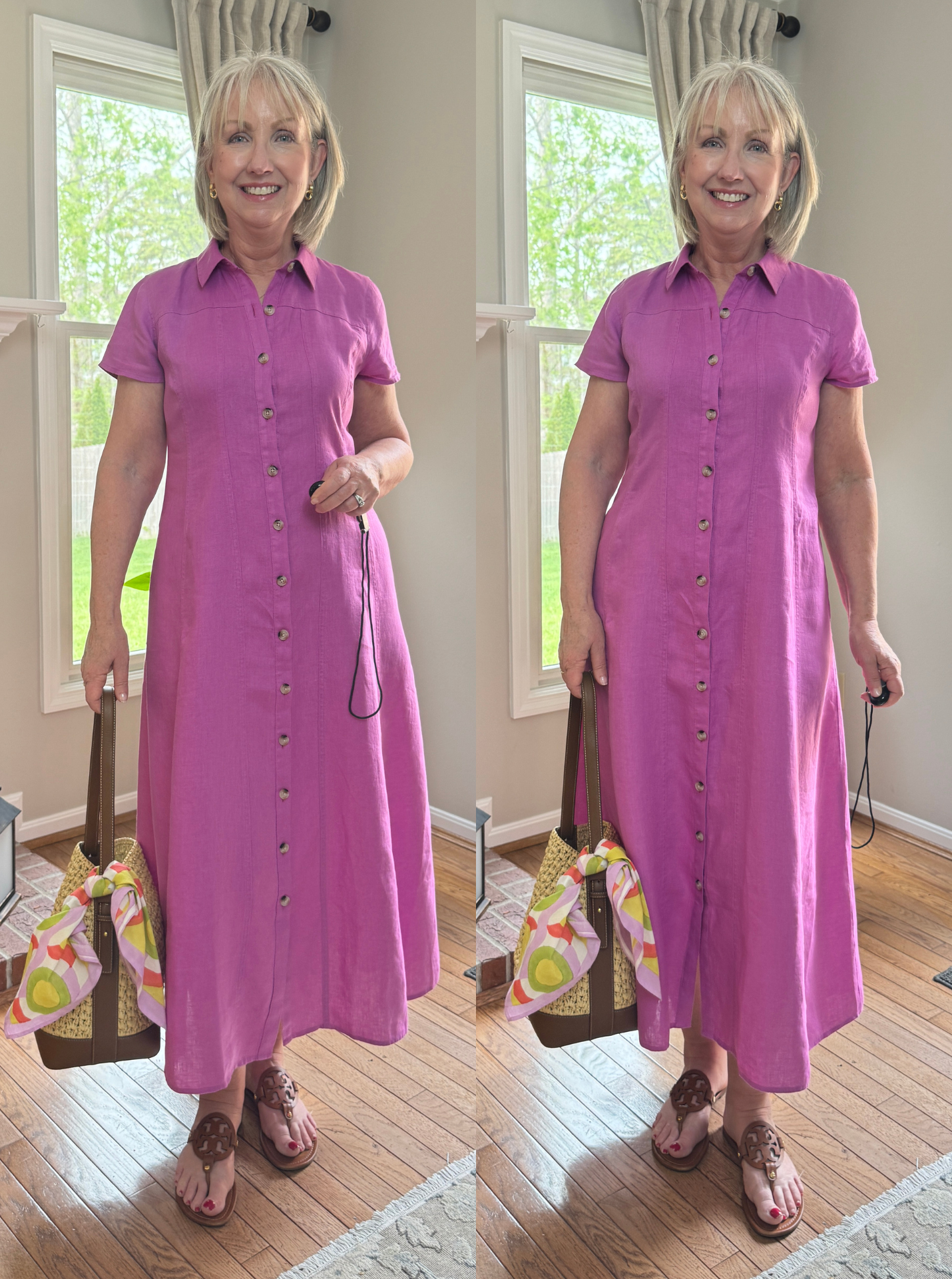 Above I’m wearing another J.Jill dress. This linen maxi shrtdress in dragon fruit is selling out fast, but they do still have a few sizes. It’s also available in a pretty navy. As usual at J.Jill, I sized down to a small for a nice fit.