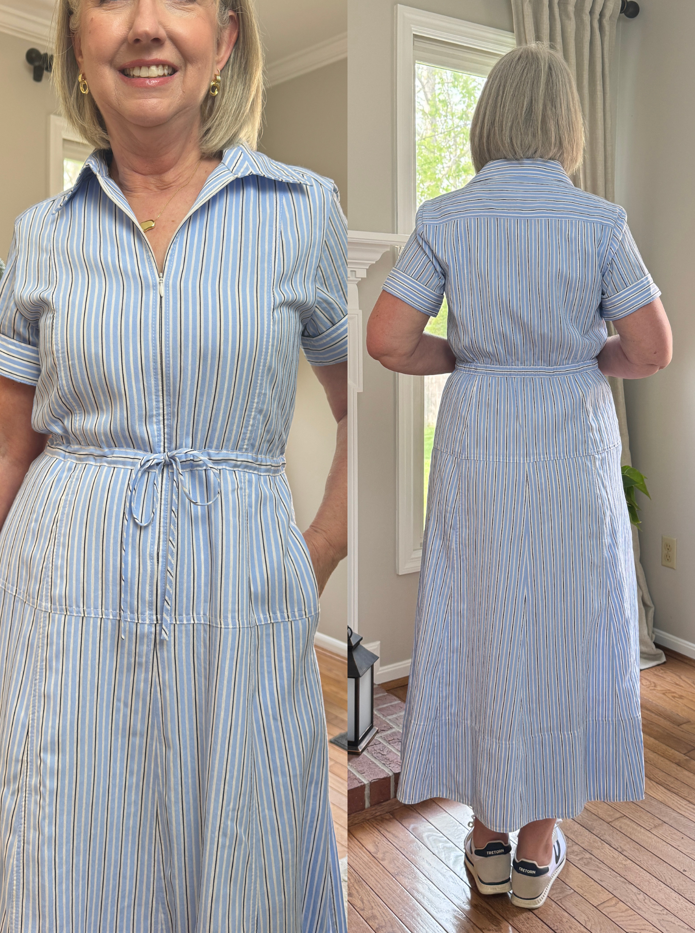 Next up I have three dresses from Me+Em. These are pricier dresses, but the quality and details are pretty amazing. I sized down to a size 8 in the zip neck shirt dress below because they didn’t have a 10 when I ordered. I had been watching this dress like a hawk for a month while they had it on the website as “coming soon.” So I wasn’t going to let it get past me. It turns out that the 8 fits beautifully. The 10 would have given me a slightly blousier fit in the top, but I’m quite happy with this one.