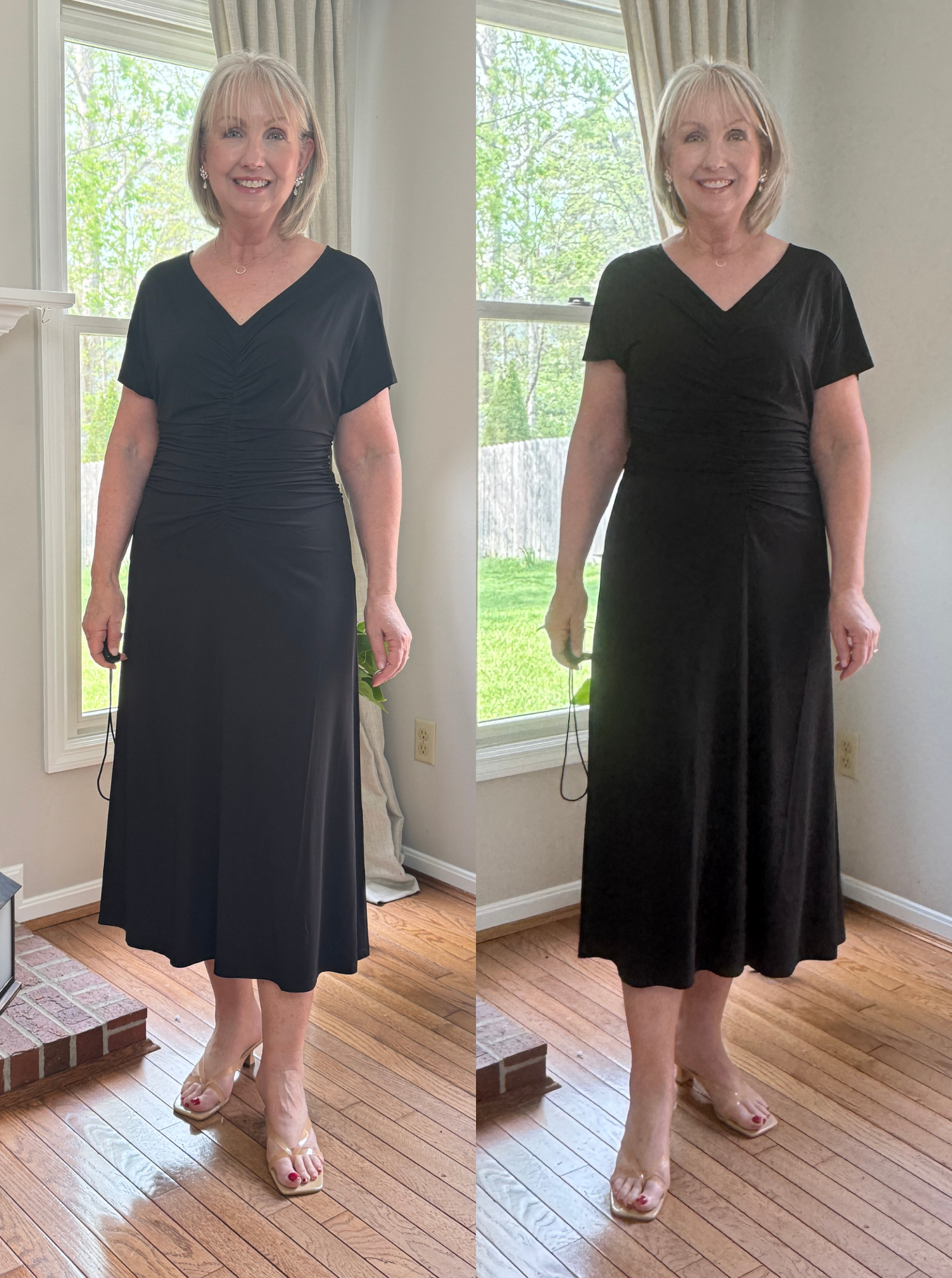 I’m wearing the dress with strappy sandals in a sheer nude strap from Dolce Vita. These are such a smart addition to your spring and summer wardrobe. They come in additional colors, so if you can find one close to your skin tone they’re especially lengthening and flattering. Quite comfortable, too.