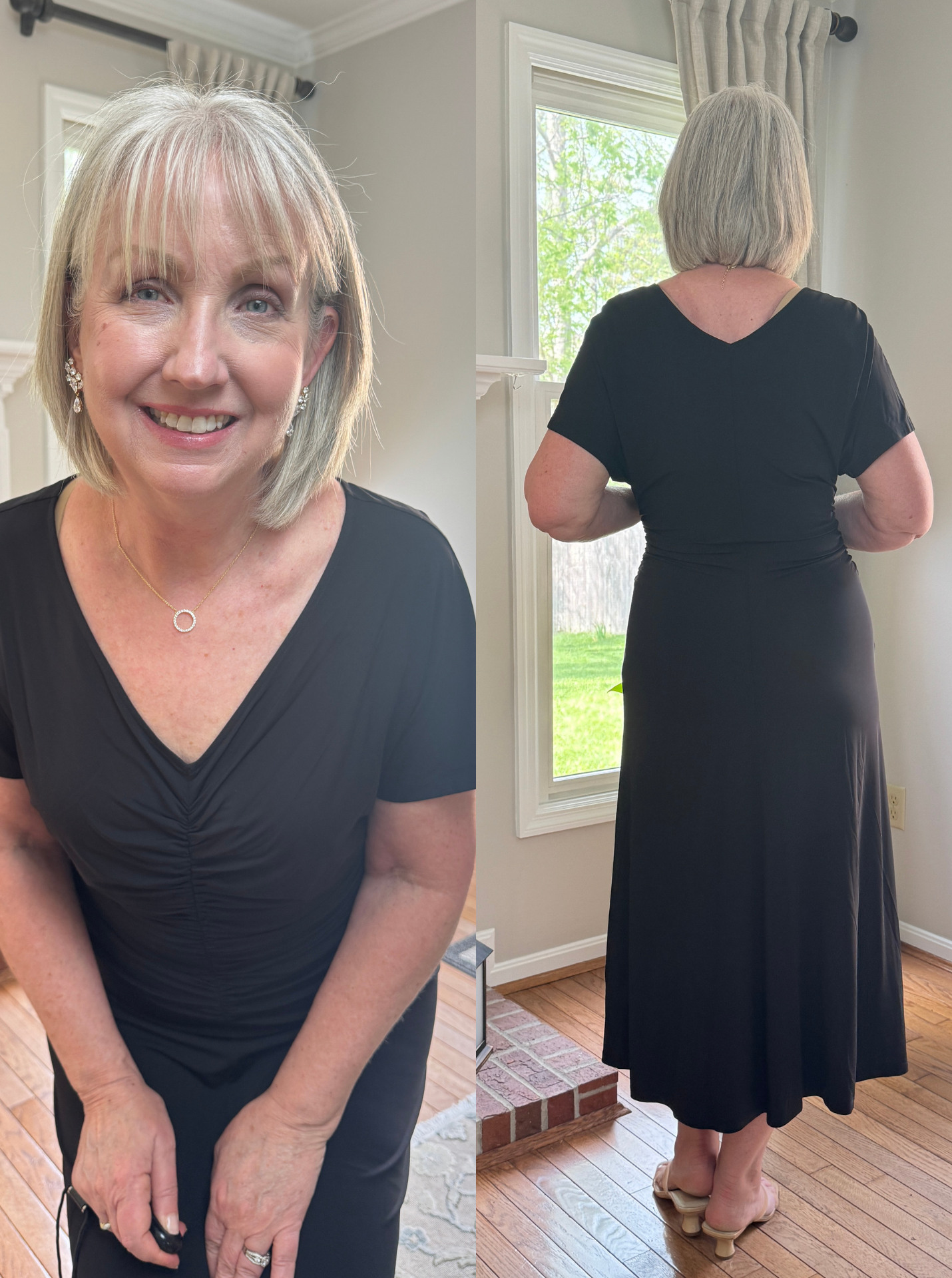 The Von ruched dress in light jersey fabric is luxe and beautiful for travel. It will pack nicely, but it’s so exquisite. I could envision wearing it multiple times on a cruise, for instance. I’ve worn the ruched dress with beautiful cluster drop earrings and an exquisite inner circle necklace, both very reasonably priced for a wedding or other special occasion.