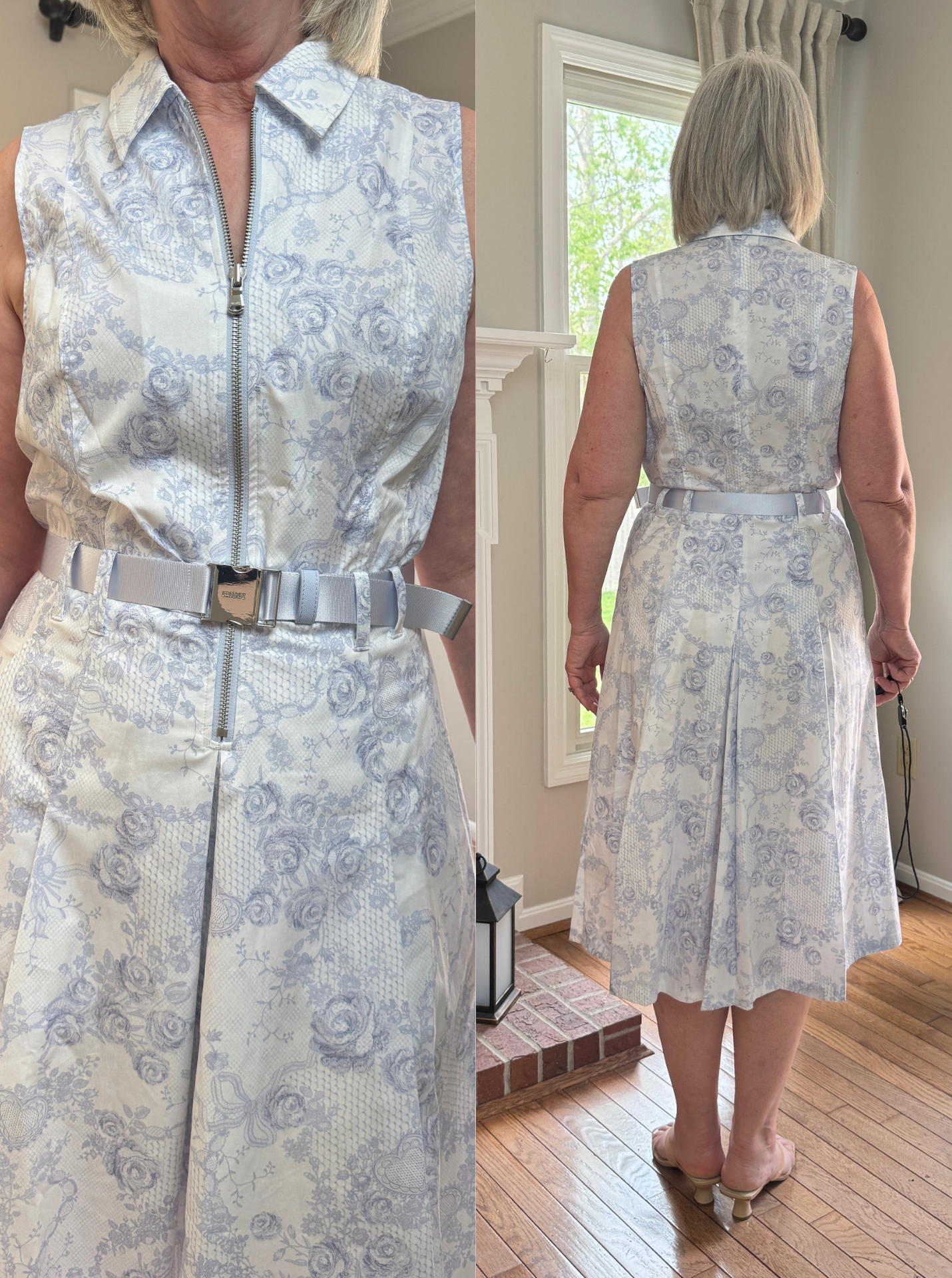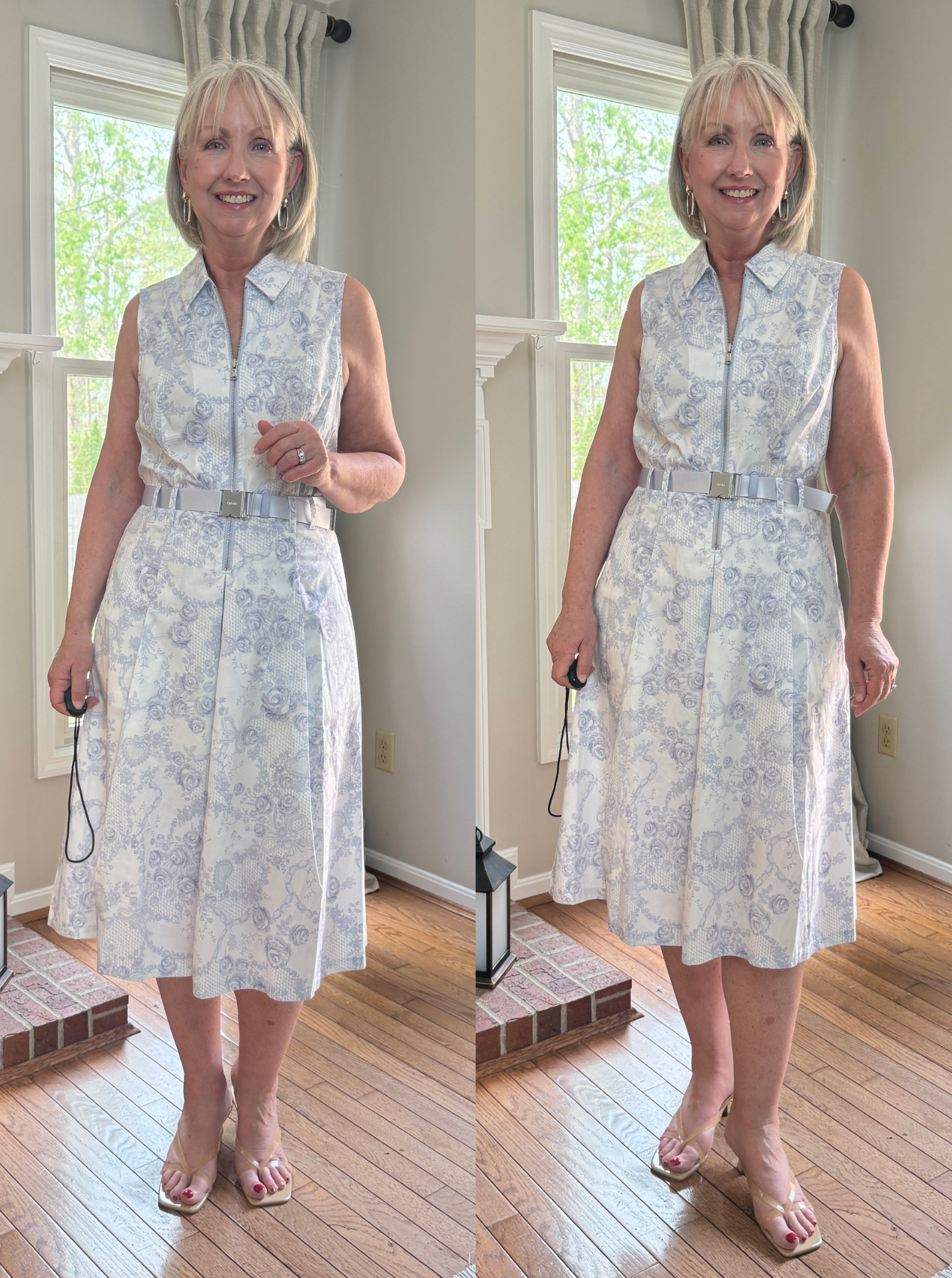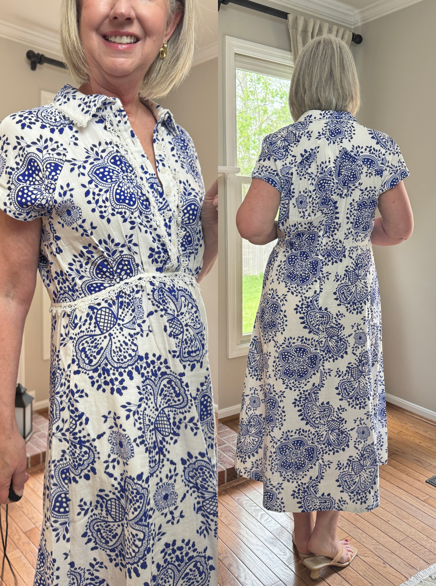 The construction on all of these dresses is truly masterful. They feel as lovely on the body as they look. Next I’m showing one of their cheesecloth dresses in a pretty fit and flare silhouette. The blue and white floral print is modern and timeless. I’m wearing my usual size 10 here for a generous fit.