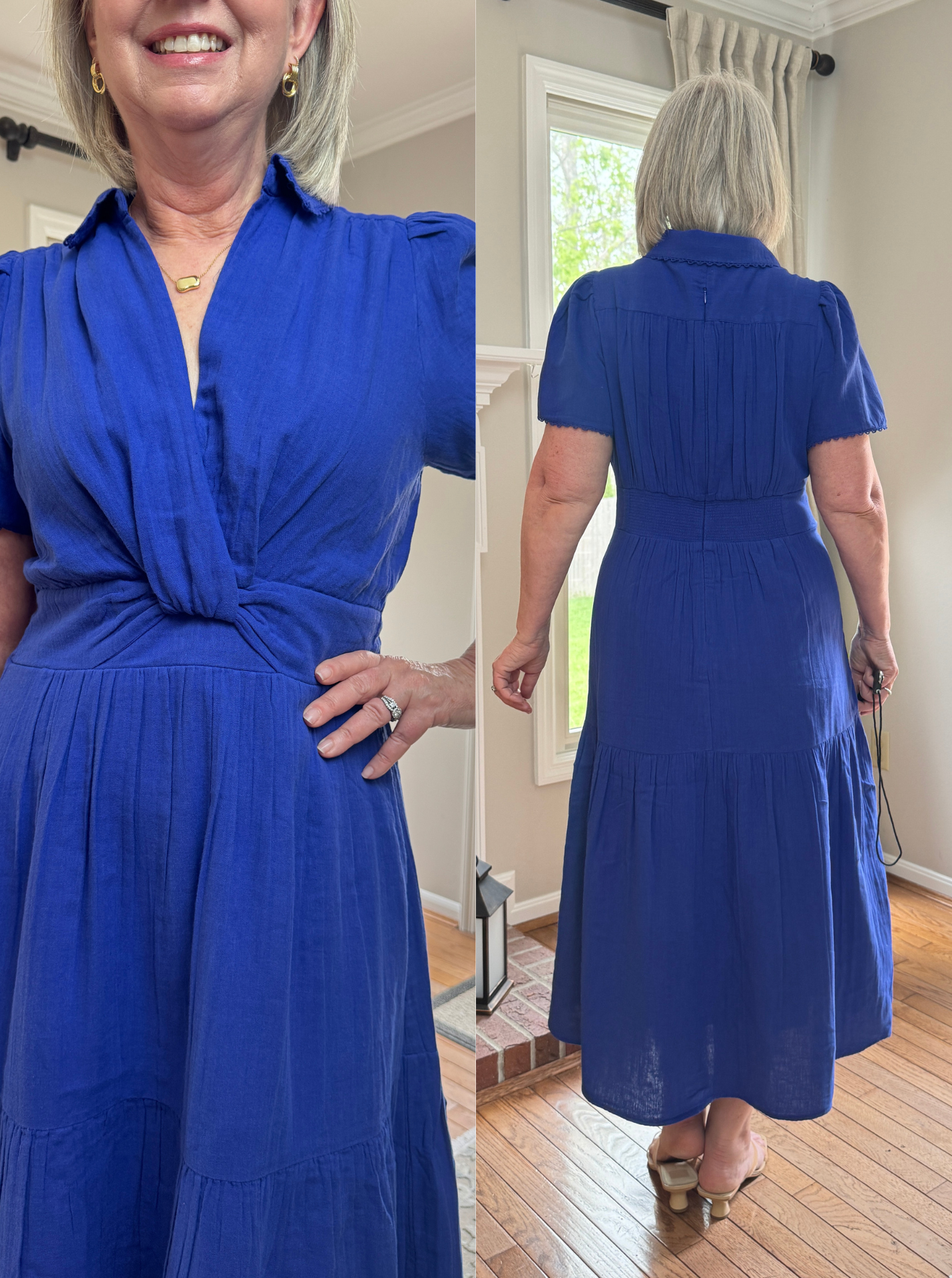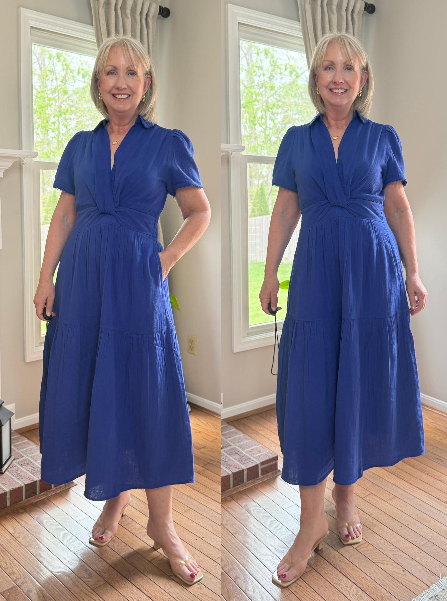 Next I’m wearing the Me+Em blue cheesecloth fit & flare maxi dress with a twist front. This dress fits true to size for a generous fit.