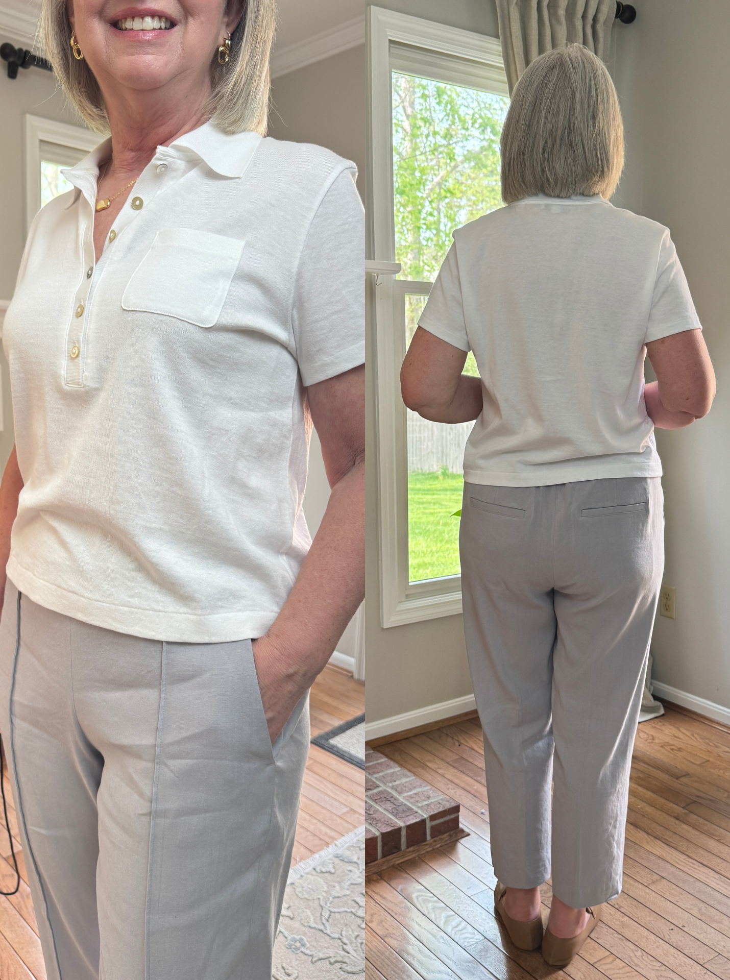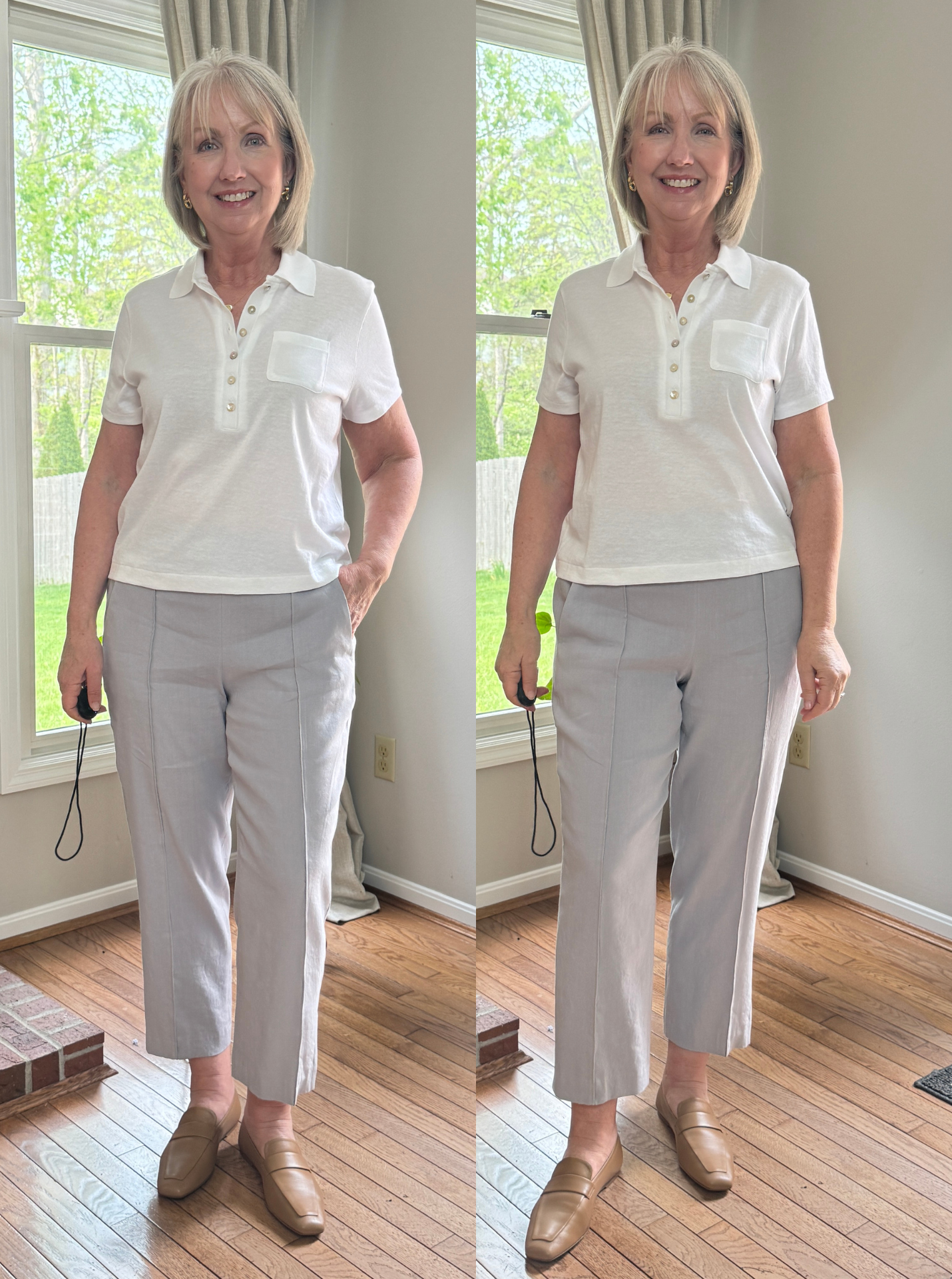 I’m wearing the polo with their Grace mid-rise linen blend pull-on pants. These fit true to size and also come in coastal navy. I think they’re a smart linen blend pant that looks a little more elevated and modern. I’m wearing the duo with my new M.Gemi Una loafers that I picked up when they were 25% off recently. They fit true to size for a snug fit. I think they’ll stretch with wear, as most good leather does. So I was confident keeping them.