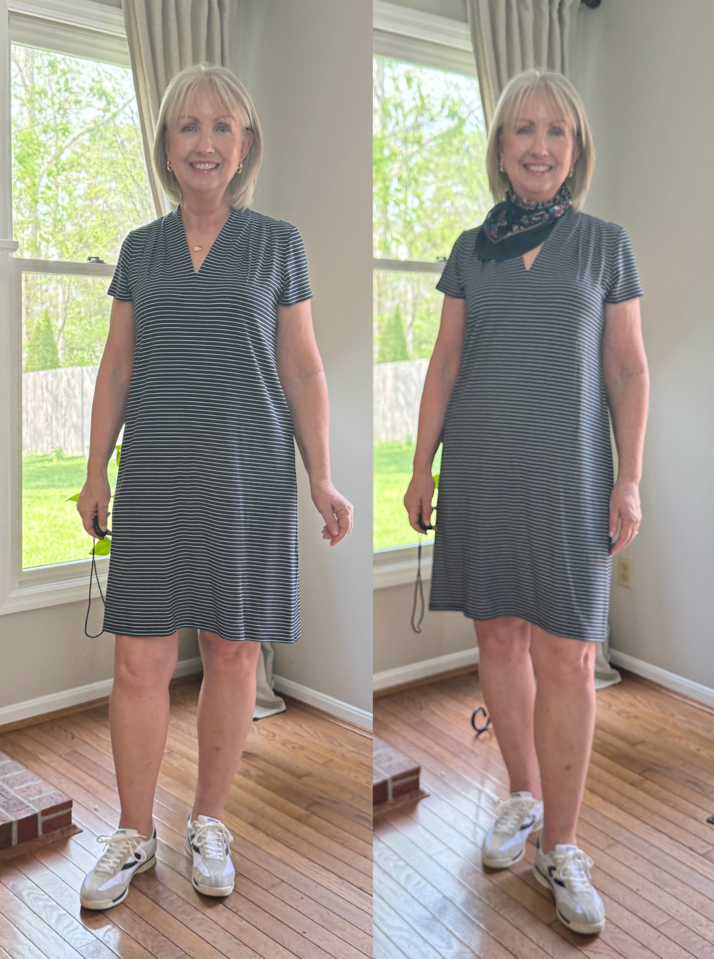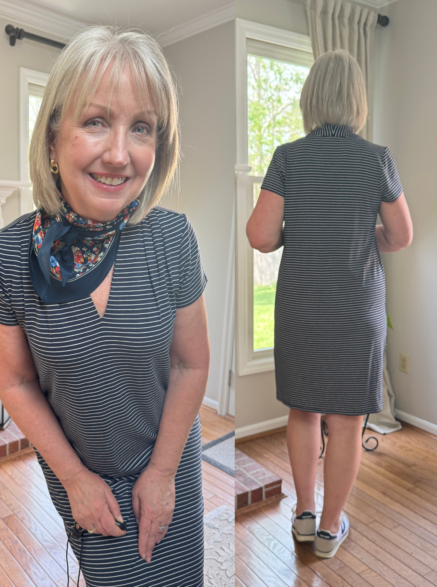 Next up I have the J.Jill dress I had hoped to take to London. However, it looks like it will be too cool for this Wearever cap sleeve A-line dress. I’m keeping it though because I have a similar black and white sleeveless dress in my closet from J.Jill that I purchased three years ago and wear frequently each summer. I sized down to a small for a nice fit.