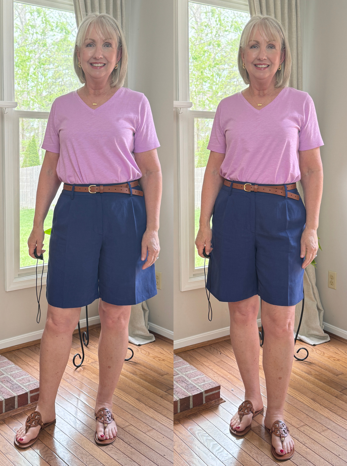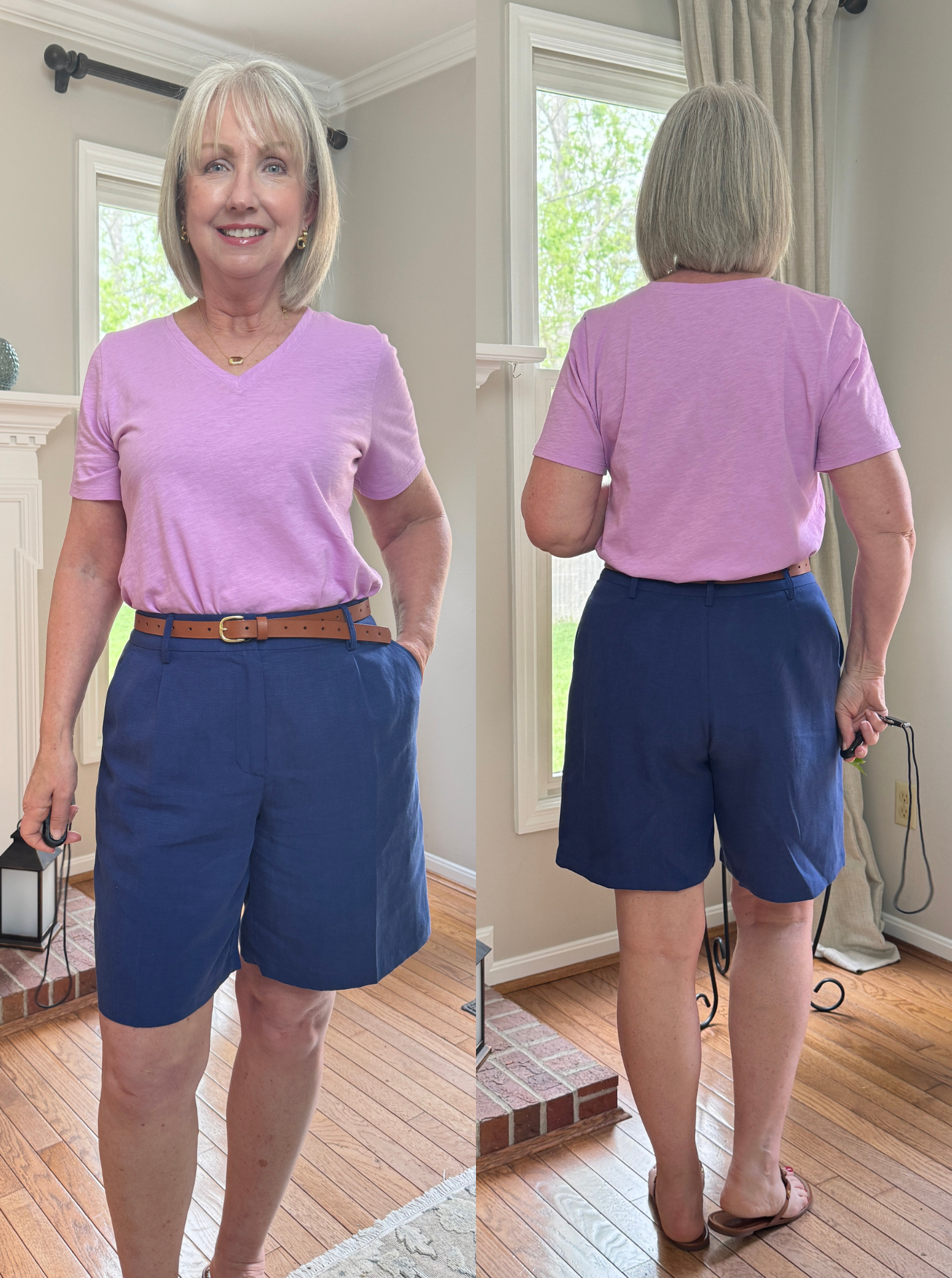 Next I’m wearing the bright aster purple V-neck slub cotton tee mentioned above with nautical navy linen blend shorts from J.McLaughlin.