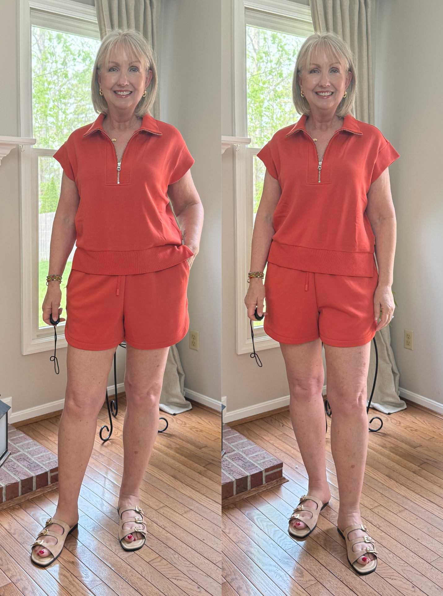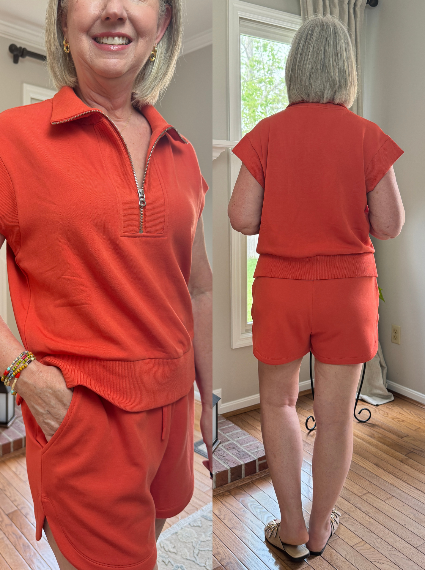 I have learned that I wear my usual size medium in Varley tops, but need a size large (per the size guide) in the bottoms. The half zip top and the shorts, both in the color summer fig, fit accordingly.