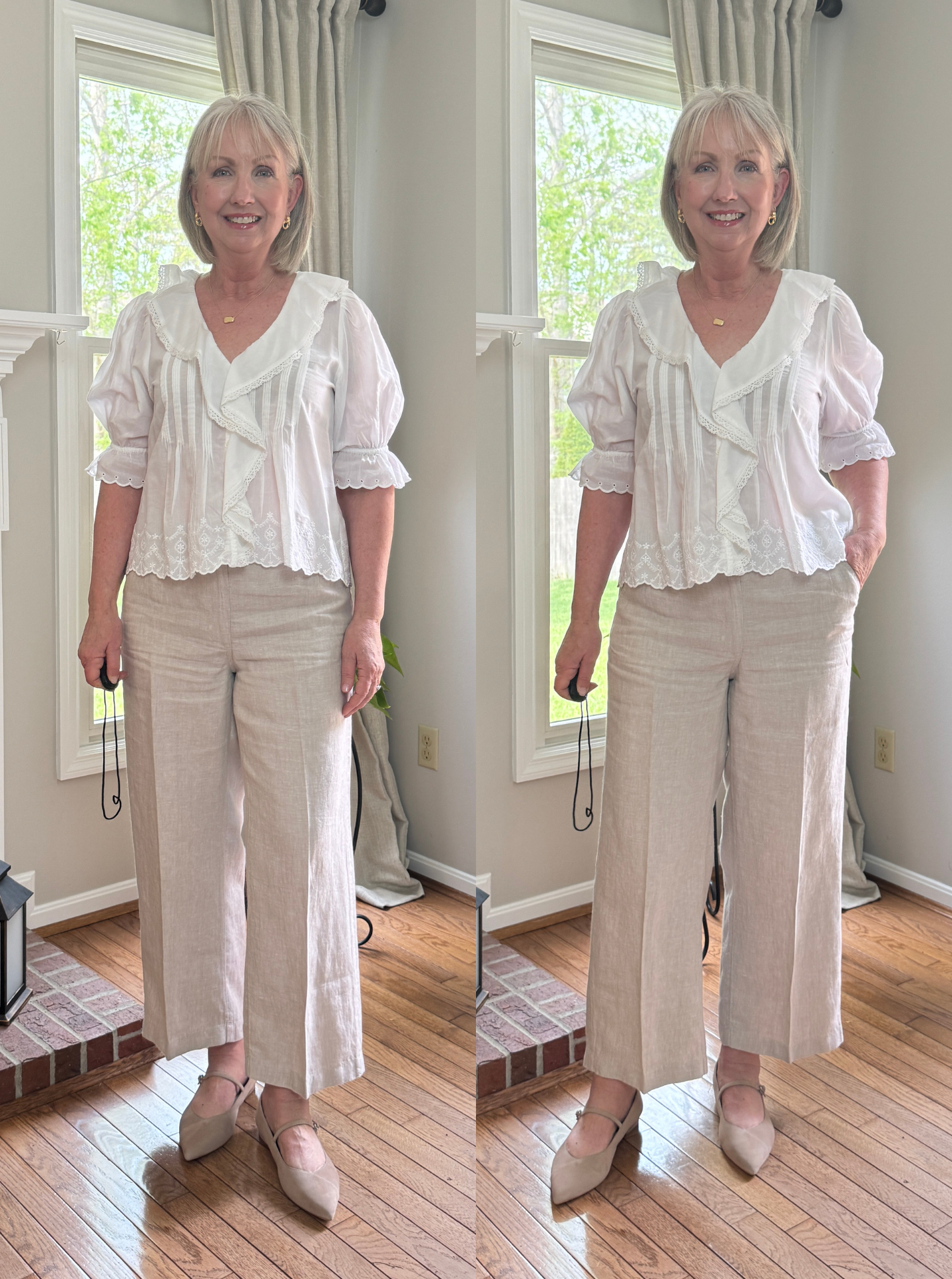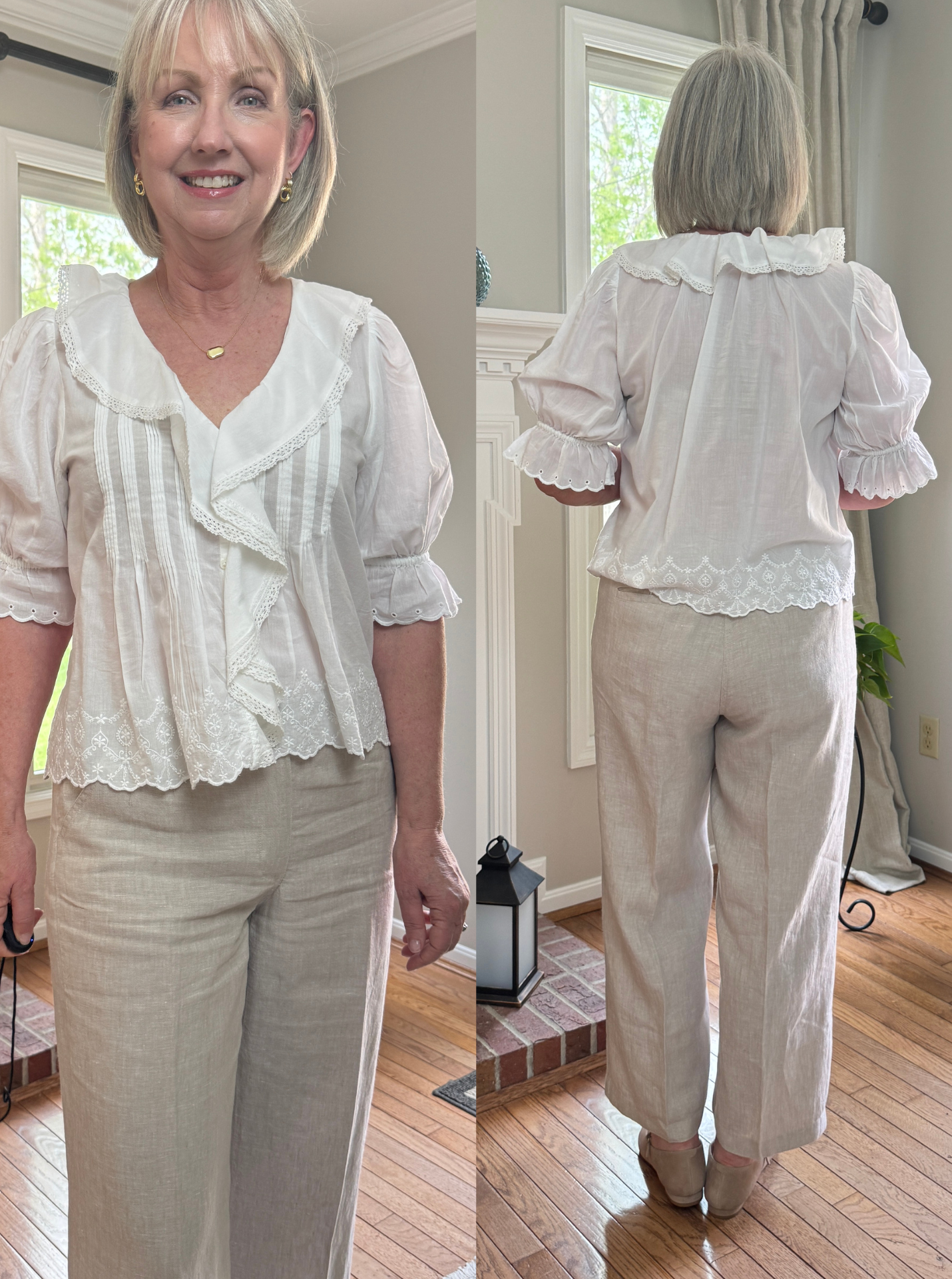 I think I’ve mentioned this feminine Blaire top from Madewell, but I don’t remember showing it here. So I put it on with my new J.Jill linen pants. The top is such a smart wardrobe addition because it adds interest to a simple pairing. It runs true to size; I’m wearing a medium for a great fit. It also comes in other colors.